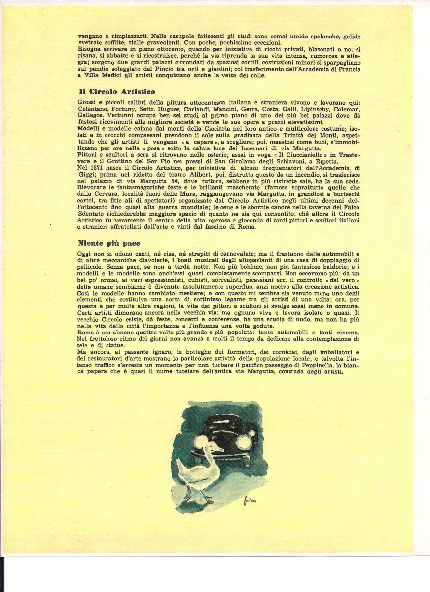 How the street came to gain its name, and became the center of an artists’ community is described in the article by Carlo Fontana, which was commissioned by a magazine in 1954. He had himself both is studio and his family’s apartment in this street, where he could meet daily some of the most representative artists of the mid-twentieth Century.